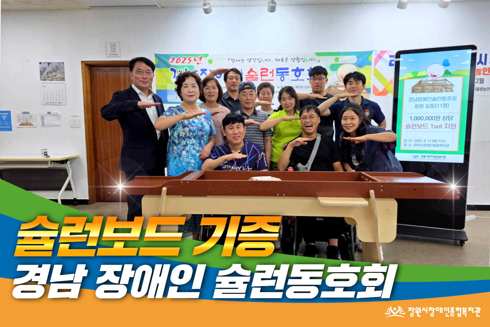 2025년 8월 11일 월요일, 우리 복지관 지하 슐런장에서 꾸준히 연습하며 좋은 성적을 거두고 있는 ‘경남 장애인 슐런동호회’ 회원 11명이 100만원 상당의 슐런보드를 기부해 주셨습니다. 동호회 회원분들은 “복지관 덕분에 마음 편히 연습하며 실력을 키울 수 있었다”며 감사의 마음을 전했습니다. 기증해 주신 슐런보드는 슐런 동아리 참여를 희망하는 장애인분...