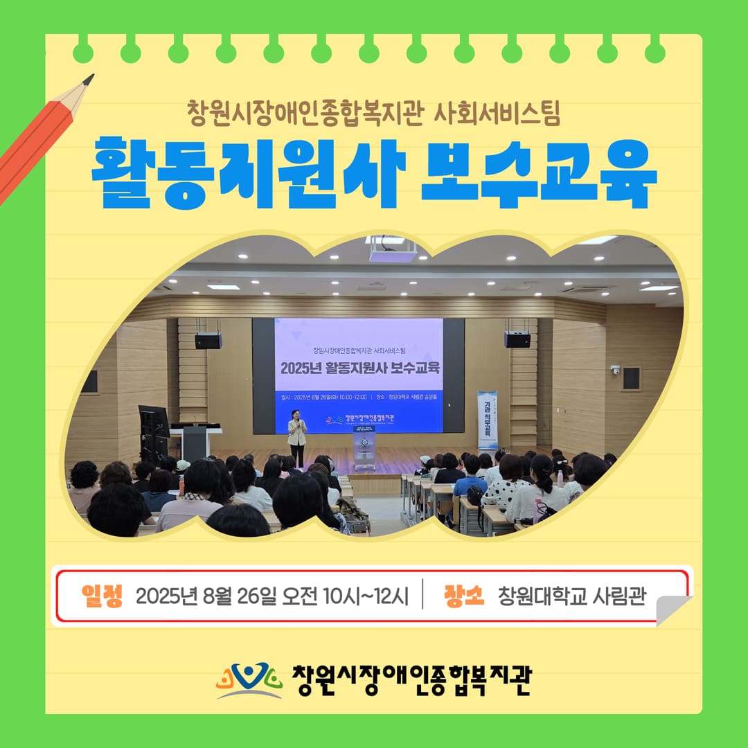 우리 복지관 사회서비스팀에서는 8월 26일 창원대학교 사림관 송원홀에서 활동지원사 150명에게 하반기 보수교육을 진행하였습니다.이번 교육 내용은 응급처치 및 심폐소생술, 활동지원사 부정수급 교육으로 활동지원서비스 질을 향상하고자 진행하였습니다.앞으로도 사회서비스팀에서는 활동지원사의 업무역량 강화와 전문성 향상을 위해 노력하겠습니다.