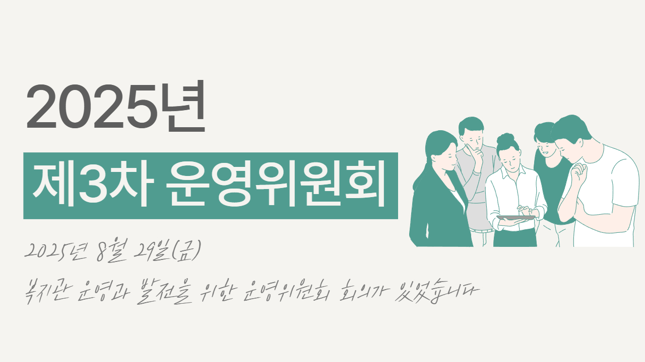 [2025. 8. 29.(금) 2025년 제3차 운영위원회 개최]복지관 운영과 발전을 위한 운영위원회 회의가 있었습니다.복지관의 사업 및 발전 방향에 대한 심도 있는 논의와 함께 오병후 위원장님의 표창장 전수식이 이뤄졌습니다.복지관을 위해 항상 노력해주시는 운영위원님들께 감사드립니다.앞으로도 복지관에 많은 관심과 격려 부탁드립니다.
