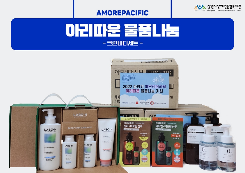 아모레퍼시픽에서 아리따운 물품나눔으로 샤워세트를 보내주셨습니다!겨울철 건조한 날씨와 피부에 필요한 스킨 케어가 가능한 샤워용품들인데요.샴푸, 트린트먼트, 바디워시, 손세정으로 머리부터 손끝, 발끝까지 향기롭고 깨끗하게 이용할 수 있습니다.감사합니다.보내주신 물품들은 복지관 이용자 분들께 유용히 사용할 수 있도록 나눠드렸습니다.다시 한 번 감사드립니다.