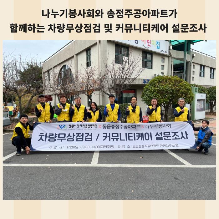 2022년 11월 20일(일) 동읍송정주공아파트와 나누기봉사회와 함께 차량무상점검서비스와 커뮤니티케어 설문조사를 진행하였습니다.이 날 행사에는 송정주공아파트 관리사무소 직원과 나누기 봉사회 9명이 참석하였으며엔진오일보충, 타이어점검, 각종전조등 확인, 워셔액보충, 와이퍼교체, 향균서비스 등 다양한 서비스를 제공하였습니다.송정주공아파트 관리사무소에서 시간마다...