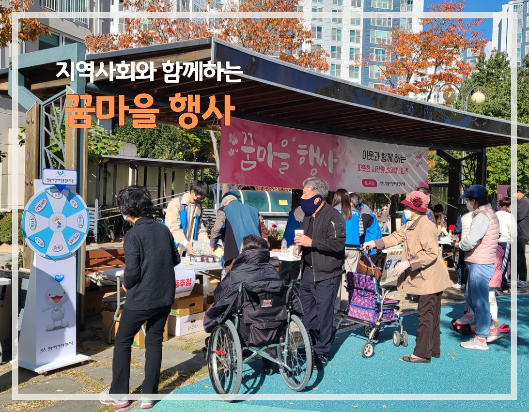 2022년 지역사회와 함께하는 꿈마을 행사깊어가는 가을~ 지역 내 장애인분들이 많이 거주하는 봉림휴먼시아파트 1,2 단지에 복지관이 찾아갔습니다. 주민들과 마을 행사에 참여하며, 일상의 즐거움을 함께하는시간이었습니다. 긴 코로나로 인해 외출 기회가 적었던 장애인분들도 오랜만에 뵙고, 이웃 간에 인사하고 안부를 묻는 소소한 일상도 느껴보았습니다. 지역주민들...