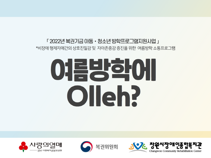안녕하세요~ 가족문화지원팀에서 진행한 여름방학에 Olleh? 프로그램 소식 전해드립니다 「2022년 복권기금 아동•청소년 방학프로그램」 공모사업으로 진행된 이번 프로그램은 창원시에 거주하고 있고, 장애형제를 둔 비장애형제자매를 대상으로 여름방학 소통프로그램을 진행했는데요.초등학교에 재학 중인 1학년, 3학년, 5학년 친구들이 신청하였고 또래소모임과 ...