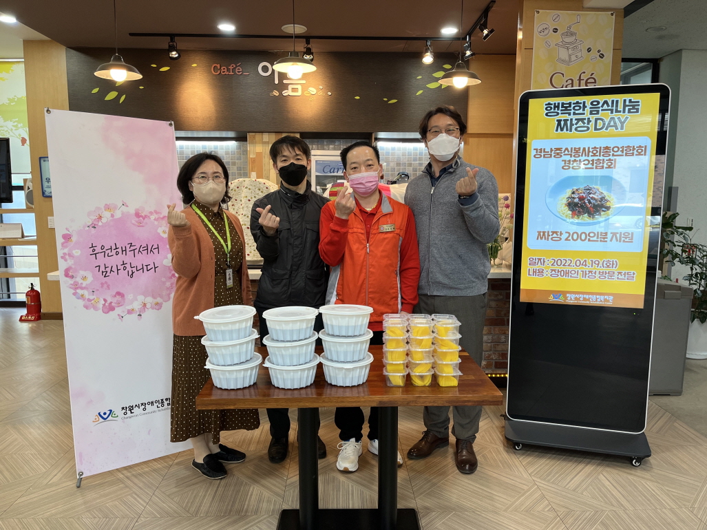 2022년 04월 19일 화요일장애인의날(2022.04.20) 주간을 맞이하여 경남중식봉사회총연합회 경창연합회와 짜장 DAY를 준비했습니다.코로나19로 직접 복지관에서 조리를 할 수 없는 상황이라 직접 짜장을 볶아서 200인분을 지원해주셨습니다.재료준비를 위해 중식봉사회 회원분들이 밤 늦게까지 고생해주셨습니다.전달해주신 짜장은 밑반찬 지...