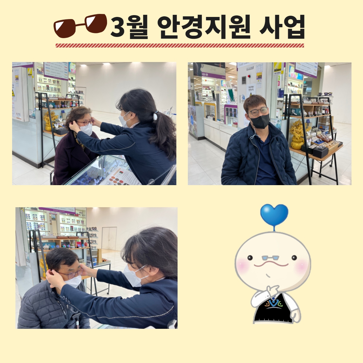 사회적 거리두기 완화로 예전의 일상생활을 찾아가는 요즘, 따뜻한 봄기운도 우리를 반깁니다.2022년 4월 안경지원 서비스 지원 사업을 진행하였습니다.가지고 있는 안경이 시력이 맞지 않아 불편을 겪고 있는 대상자 분들이 많습니다.매월 3명씩 대상자를 선정하여 안경지원을 하고 있습니다. 늘 친절하신 시호비전 대표님께 감사드립니다.앞으로도 꾸준히 사업이 진행될 ...