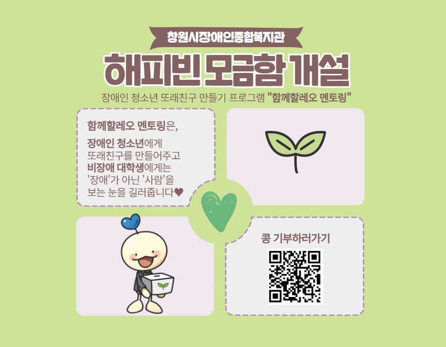 안녕하세요 ?5월부터 새로운 멤버들과 함께 시작될 함께할레오 2기, 멘토링 프로그램 !해피빈을 통해 신규 모금함이 개설되었습니다 :)"함께할레오 멘토링" 프로그램은주 1회, 비장애 멘토 2인과 장애 청소년 멘티 1인을 매칭하여,다양한 활동을 통해 긍정적 관계를 쌓아나갈 수 있도록 지원하는 프로그램으로올해 역시 창원대학교 레오 봉사단과 함께 진행하게 되었는데...
