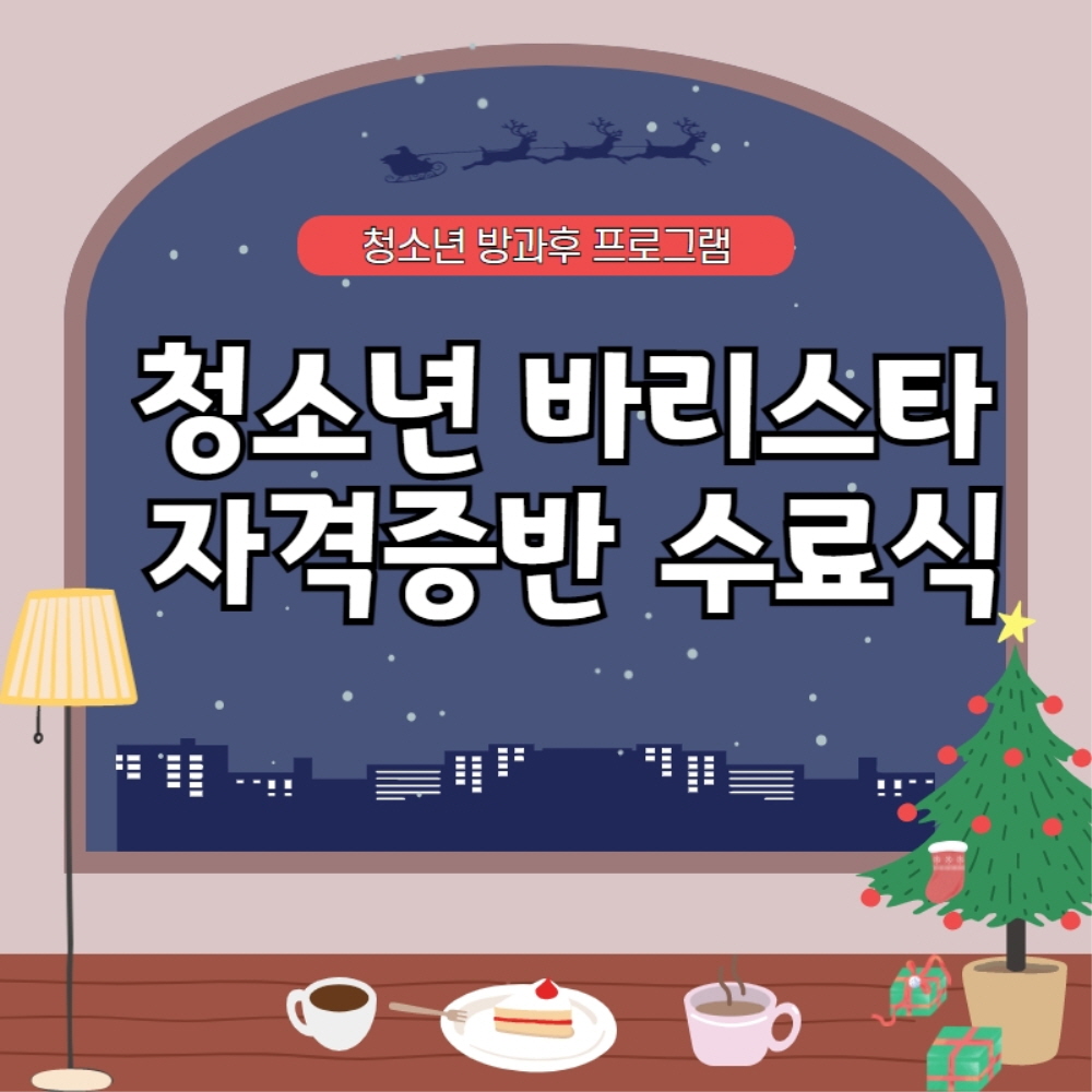 2021년 청소년 바리스타자격증반 수료식을 하게 되었습니다. ! 바리스타 수업은 3월부터 12월 까지 오후 4시부터 6시까지 열심히 수업을 진행하였습니다 :) 바리스타자격증반 교육생들은 12월에 바리스타 실기시험을 응시하여 전원 합격하는 좋은 결과를 이뤘습니다 ^^ ...