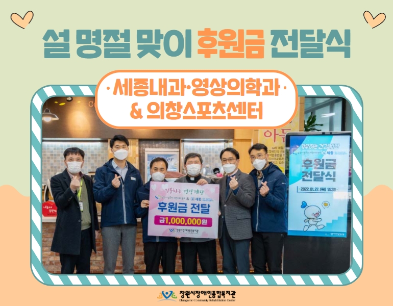 안녕하세요 :)27일(목), 창원세종내과영상의학과(원장 송성국)와 의창스포츠센터(센터장 고정식)은오늘 복지관에 방문하여 「기부하는 건강계단」 성금 전달식을 가졌습니다 :)「기부하는 건강계단」은 2019년 5월 31일 의창스포츠센터에 준공하여 창원세종내과영상의학과의원이후원협약을 맺어 운영하는 '공간형 후원 시스템'으로, 지하 2층에서 지상 4층까지...