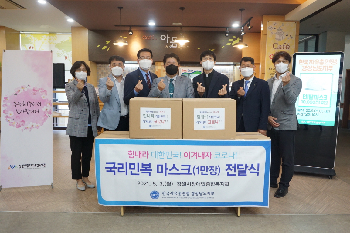 한국자유총연맹 경남지부(회장 오병후)는 창원시장애인종합복지관에 마스크 10,000장을 후원하는 전달식을 가졌습니다.이날 오병후 회장은 “한국자유총연맹이 국민행복과 국가발전을 뜻하는 ‘국리민복’을 최고의 판단 기준으로 삼아 목적사업을 시행가고 있는 바 금번 코로나19 예방관련 더불어 함께사는 세상을 위하여 사회안전망 구축을 위해 장애인 단체에 마스크를 기탁하...