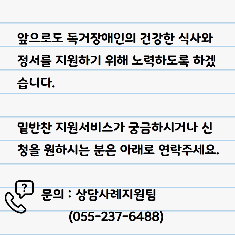 ■ 대상 : 창원(성산구/의창구)에 거주하고 있는 독거저소득장애인 중 조리 및 식사준비가 어려운자