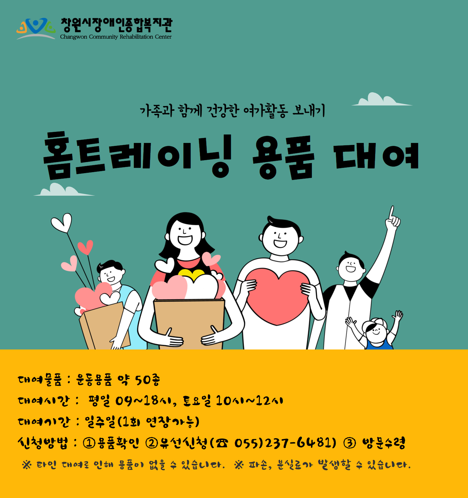 가족과 함께 건강한 여가활동 보내기 [홈트레이닝 용품 대여] 안내입니다.저희 복지관 체육지원팀은 코로나19 확산 및 장기화에 따른 서비스 욕구조사에 맞춰 여러가지 대응활동 중이며가정 내 운동용품 지원 욕구에 맞춘 [홈트레이닝 용품 대여]를 실시하게 되었습니다.많은 이용 부탁드리며 내용은 위 포스터를 참고하시면 되겠습니다. 감사합니다.