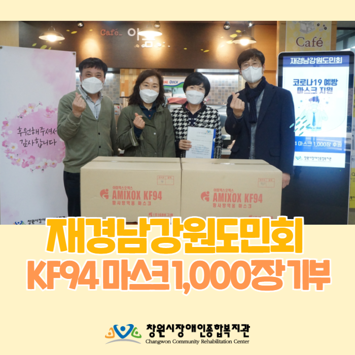 2021년 03월 16일(화)재경남강원도민회에서 복지관에 방문하여 전달식을 가졌습니다.후원해주신 KF94 마스크 1,000장은창원 의창구, 성산구 지역 장애인의 안전을 위해 소중히 전달하도록 하겠습니다.이번 후원을 통해 복지관과 좋은 인연이 되길 바랍니다.감사합니다.