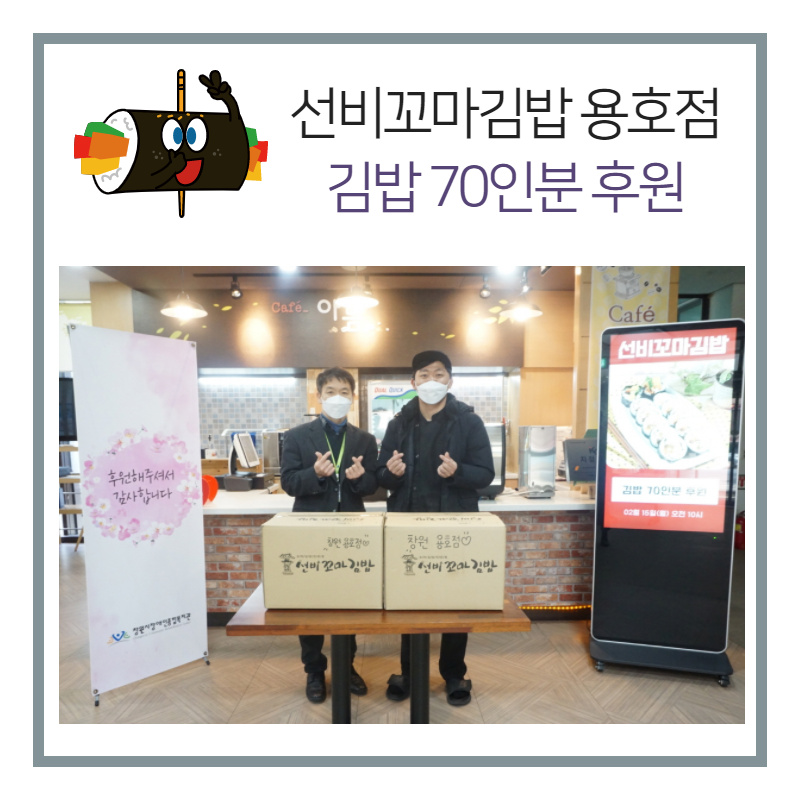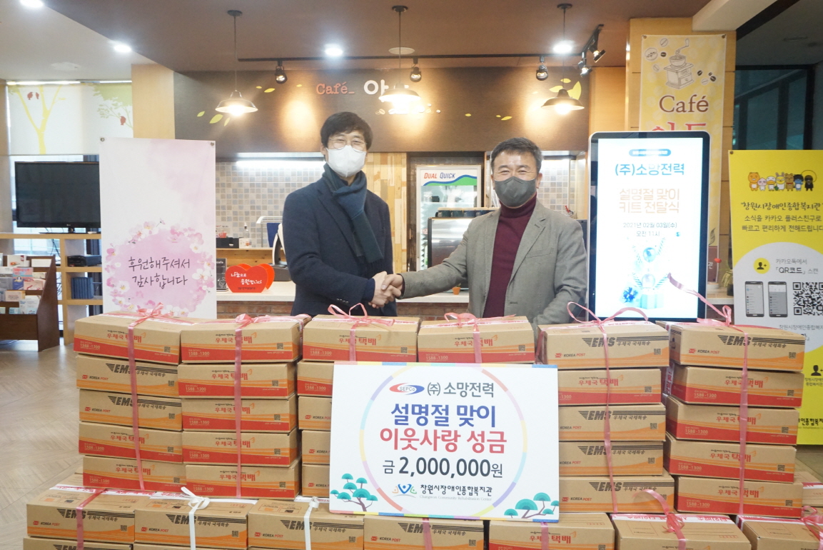 2월 3일(수) 창원시장애인종합복지관(관장 이중기)은 ㈜소망전력(대표이사 정동근) 설 명절을 맞이하여 지역사회의 어려운 장애인을 위해 떡국 키트를 전달하는 후원 전달식을 진행하였습니다.㈜소망전력(대표이사 정동근)은 2019년부터 설명절 때마다 200만원씩 지역의 어려운 장애인들을 위해 후원금을 전달하고 있습니다.㈜소망전력(대표이사 정동근) 2019년 2백...
