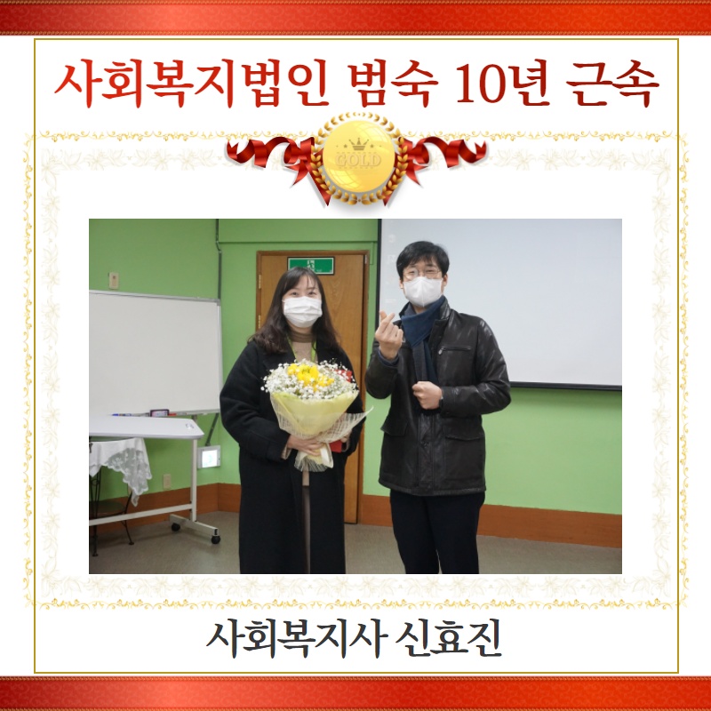 이어 신효진 사회복지사는 사회복지법인<범숙> 10년 장기근속과 관련하여 표창장을 수여하였습니다.