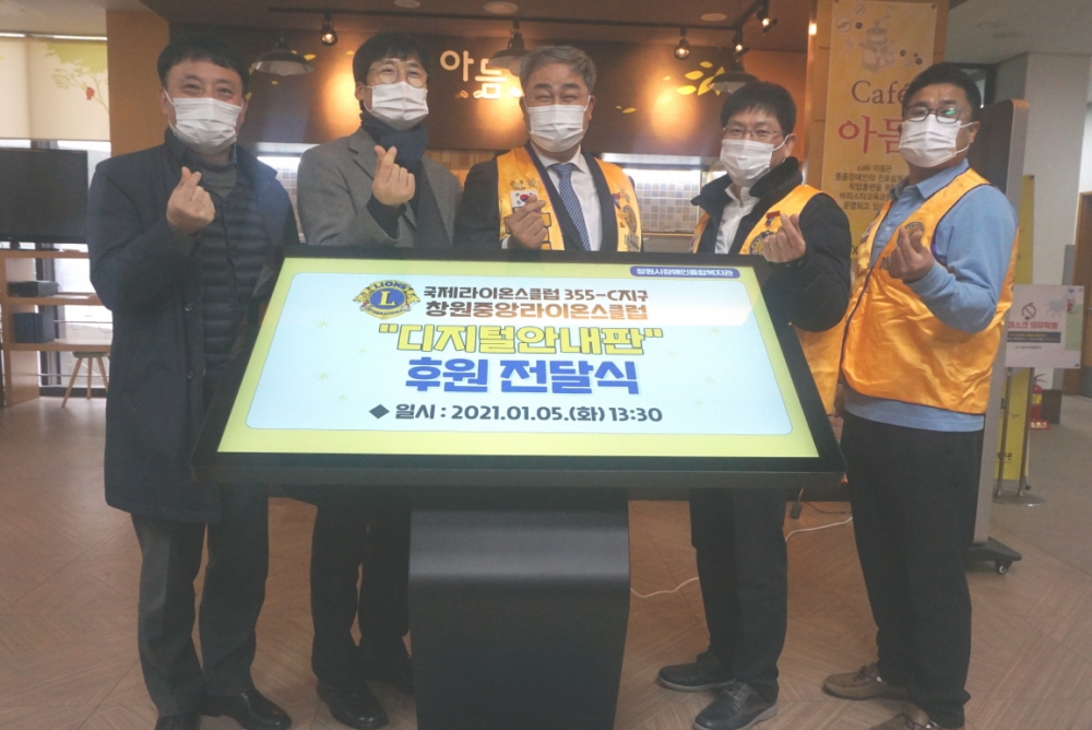 창원시장애인복지관(관장 이중기)은 창원중앙라이온스클럽(회장 전병록)으로부터 복지관 이용자 안내를 위한 디지털 안내판과 아듬카페 직원 업무 능력 향상을 위한 포스기 등 총 500만원 상당의 후원물품을 지원하는 전달식 행사를 진행하였습니다.