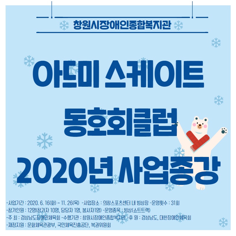 ○사업개요 -사 업 명 : 경상남도장애인생활체육지원사업『2020년 아드미 스케이트 동호회클럽』 -사업목적 : 발달장애인들에게 동계스포츠의 꽃인 스케이트활을 통해 즐거움을 제공하고 균형 있는 신체활동을 향상시키기 위함 -사업기간 : 2020. 6. 16(화) ~ 11. 26(목) -사업장소 : 의창스포츠센터 내 빙상장 -참가인원 : 12명...