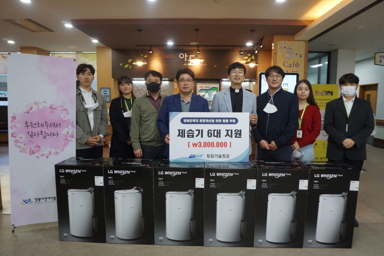 10월 19일(수) 창원기술정공(대표 오병후)은 복지관 방문객 및 이용자의 편의와 쾌적한 환경을 제공하기 위해 300만원 상당의 제습기 6대를 복지관에 후원하는 전달식을 창원시장애인복지관(관장 이중기)에서 진행하였다. 올해 여름, 태풍으로 인해 체육관 및 지하 프로그램실에 침수피해가 있었고 이를 처리하는 과정에서 습기를 제거하는 부분에 어려움을 겪었으...