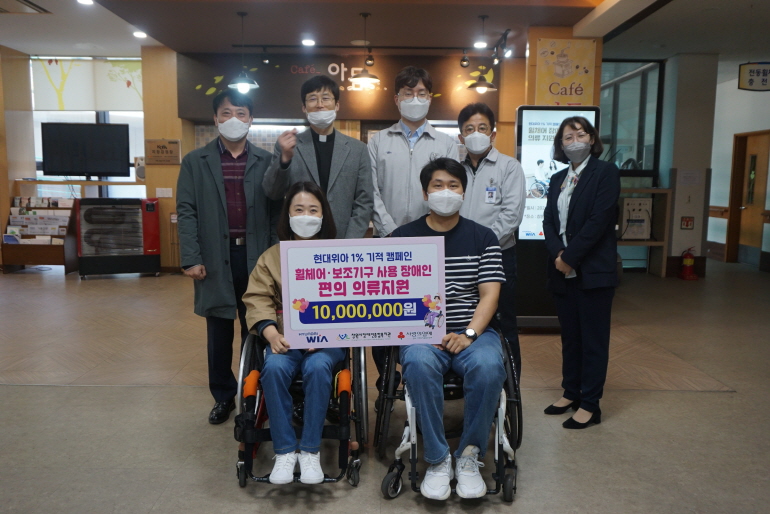 4월 29일 장애인의 날(04.20)을 맞이하여 <현대위아 1% 기적> 사업의 일환으로 창원시장애인종합복지관에 1,000만원 상당의 장애인을 위한 편의의류를 구매할 수 있는 성금을 전달하였습니다.이날 전달식에는 박진환 현대위아 특수생산부 기술선임 및 임직원, 이중기 창원시장애인종합복지관장, 신희정 경남사회복지공동모금회 모금사업팀장 등 관계자들이...