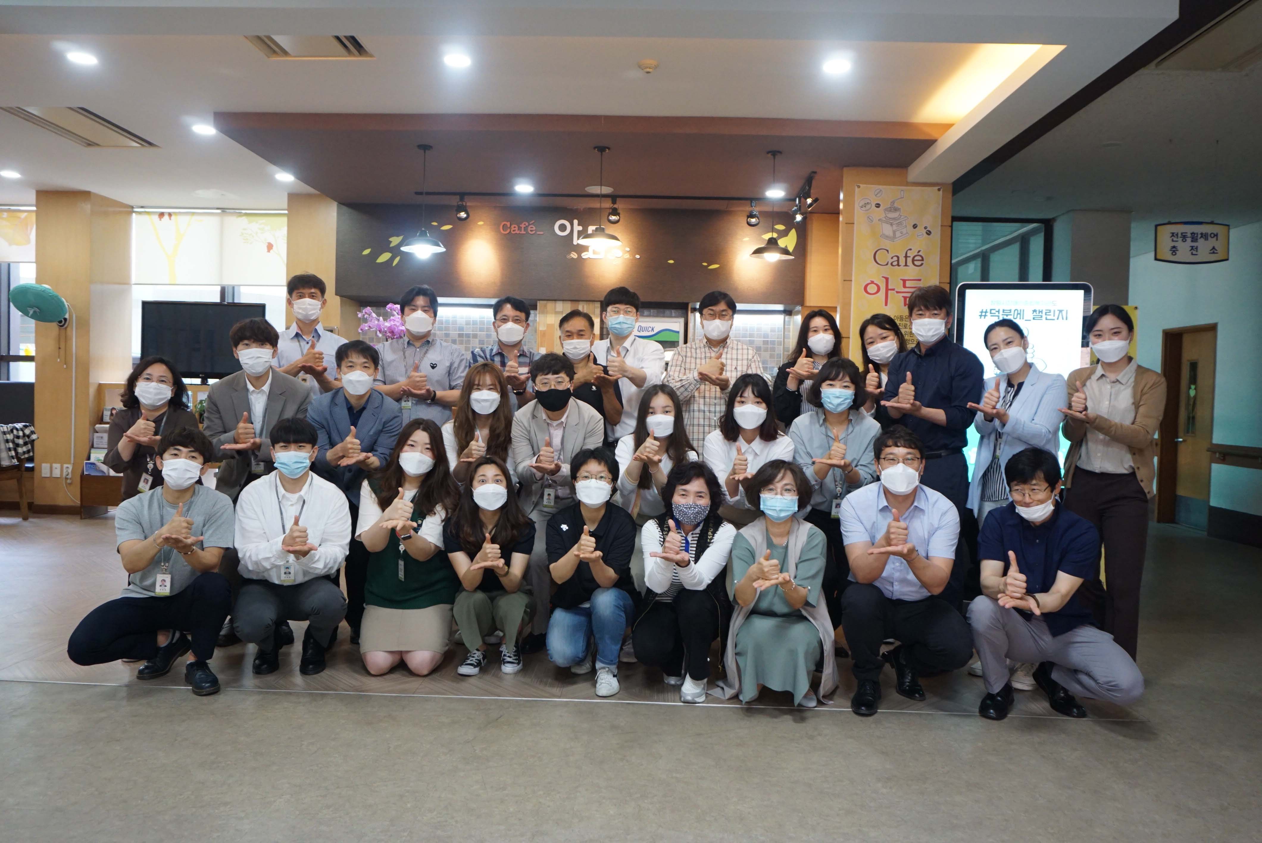 우리은행 창원공단금융센터에서 따뜻한 성금 200만원을 들고 복지관을 방문해주셨습니다.오랜만에 복지관에 많은 사람들이 방문해주셔서 활기찬 모습이었습니다. 성금전달식을 마치고 우리은행 창원공단금융센터 직원들은 1층 아듬카페를 청소했습니다.후원해주신 우리은행 창원공단금융센터에 감사드립니다.전해주신 성금은 장애인복지 발전에 사용하도록 하겠습니다.