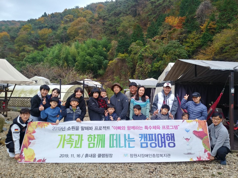 2019년 소원을 말해봐 프로젝트<아빠와 함께 하는 특수체육 프로그램> “가족이 함께 떠나는 캠핑여행”을 다녀왔습니다. 이번 사업은 아빠와 그 가족이 함께 캠핑여행을 통해 가족의 소중함을 함께 느끼고, 소통하는 유익한 시간이 되었습니다! □ 언 제 : 2019. 11 .16(토) ~ 17(일) 1박 2일 □ 어디서 : 통영시 도산면(...