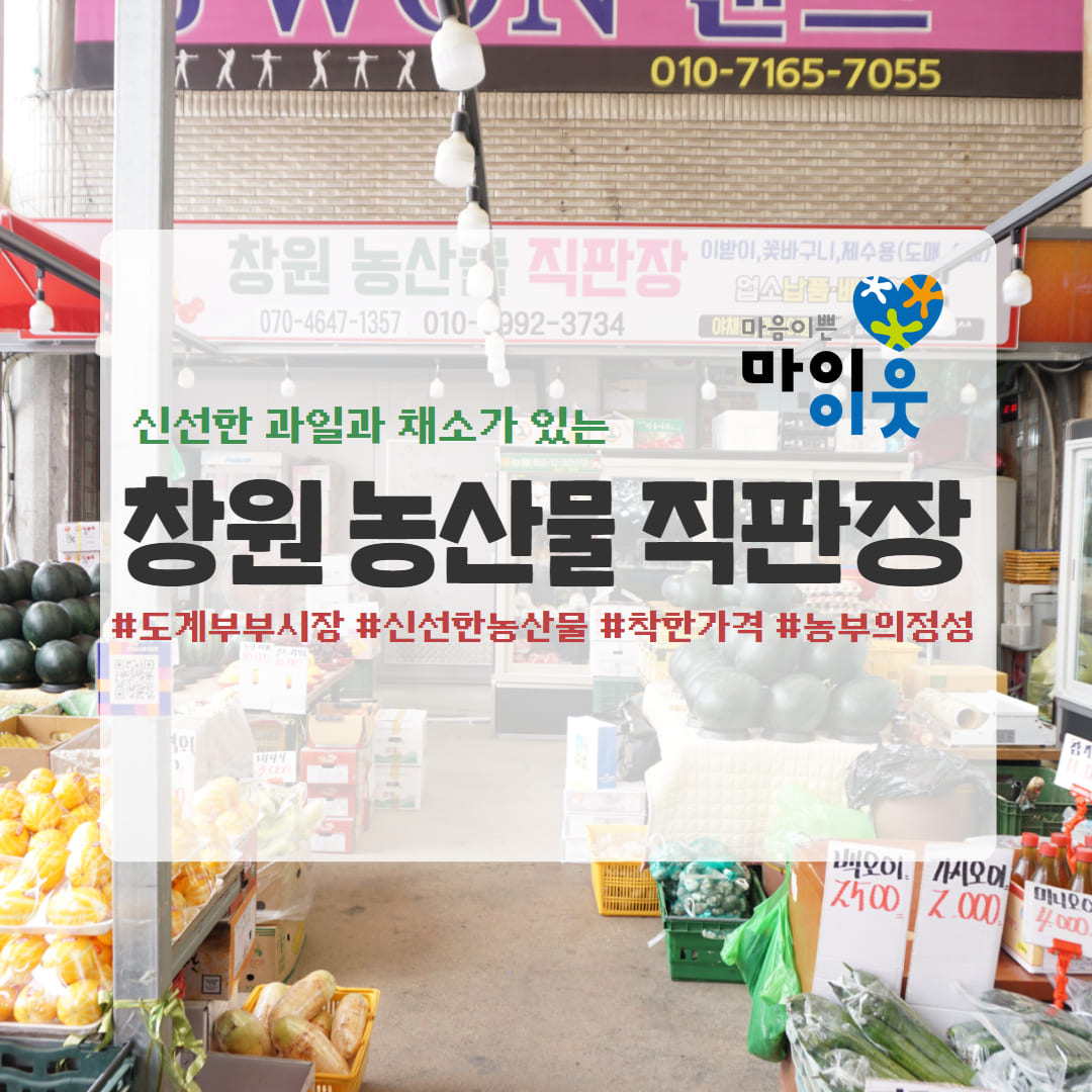 복지관의 새로운 이웃, 마이이웃 80호점 '창원 농산물 직판장'을 소개합니다! 도계부부시장 동문 입구에 자리한 '창원 농산물 직판장'이 마이이웃 80호점으로 함께하게 되었습니다. '창원 농산물 직판장'은 다양한 농산물을 직거래로 유통하여 질 좋은 과일과 채소를 저렴한 가격에 구매할 수 있어 많은 분께 사랑 받는 곳입니다.건강하고 신선한 먹거리를 합리적인 가...