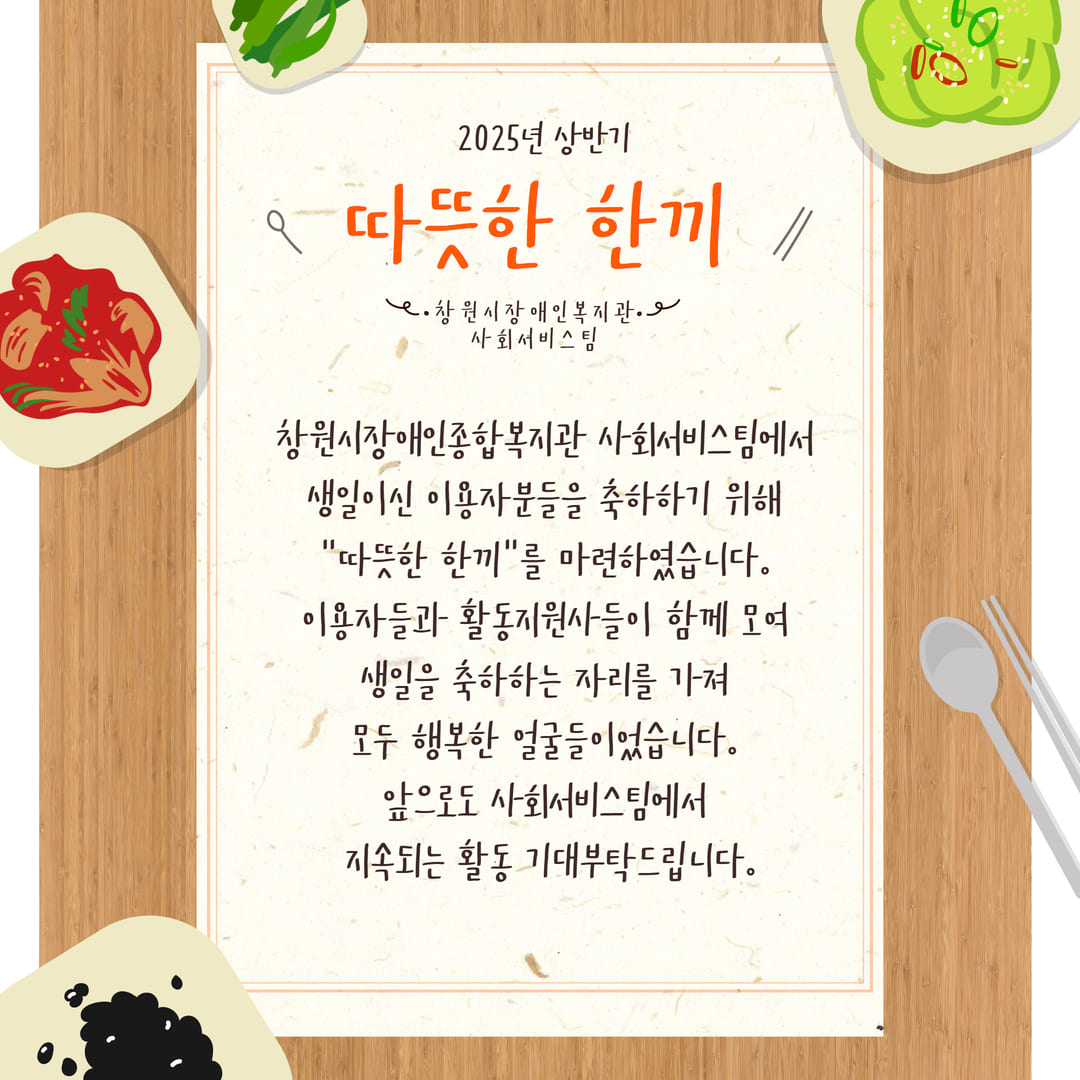 창원시장애인종합복지관 사회서비스팀에서 생일이신 이용자분들을 축하하기 위해 "따뜻한 한끼"를 마련하였습니다. 이용자들과 활동지원사들이 함께 모여 생일을 축하하는 자리를 가져 모두 행복한 얼굴들이었습니다. 앞으로도 사회서비스팀에서 지속되는 활동 기대부탁드립니다.
