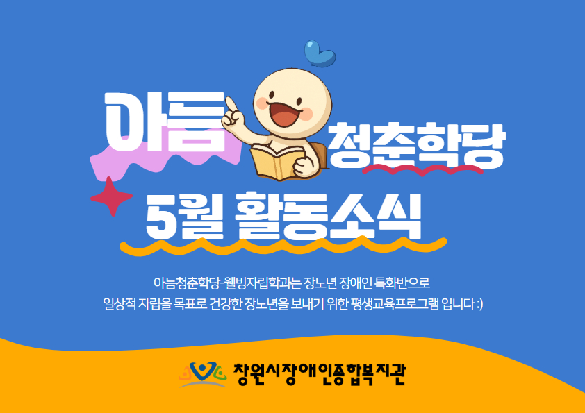 아듬청춘학당은, 경남인재평생교육진흥원의 공모지원사업으로 장노년 장애인의 일상적 자립을 위한 대학형 평생교육 프로그램입니다. 일상생활에서의 자립을 위한 웰빙조리, 경제교육과 신체, 정신적 건강증진을 위한 운동, 도자기교실 프로그램 등 다양한 활동을해나가고 있는 아듬청춘학당의 5월 소식을 전해드릴게요 :) 청춘학당 수강생분들이 가장 적극적으로 참여하는 웰빙조...