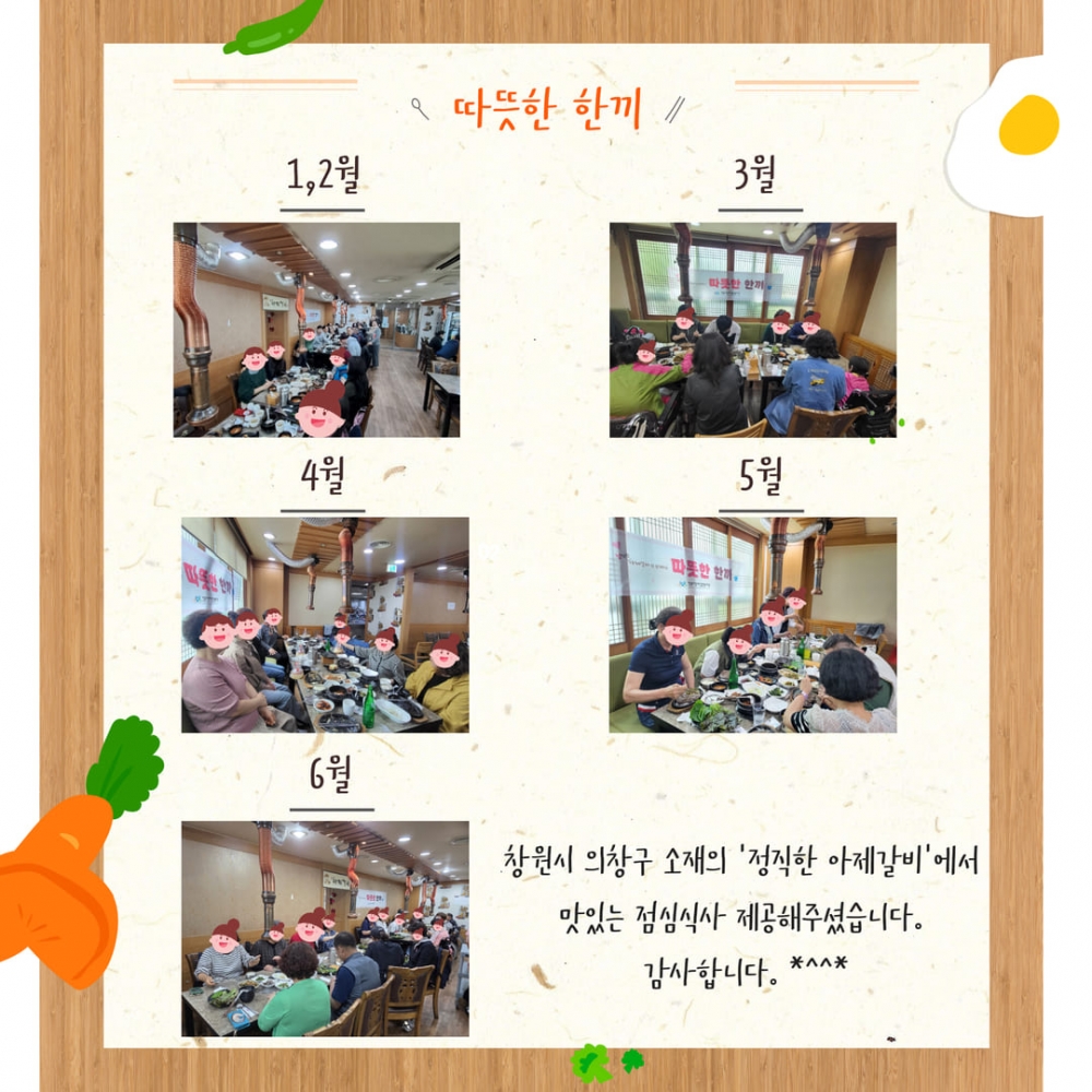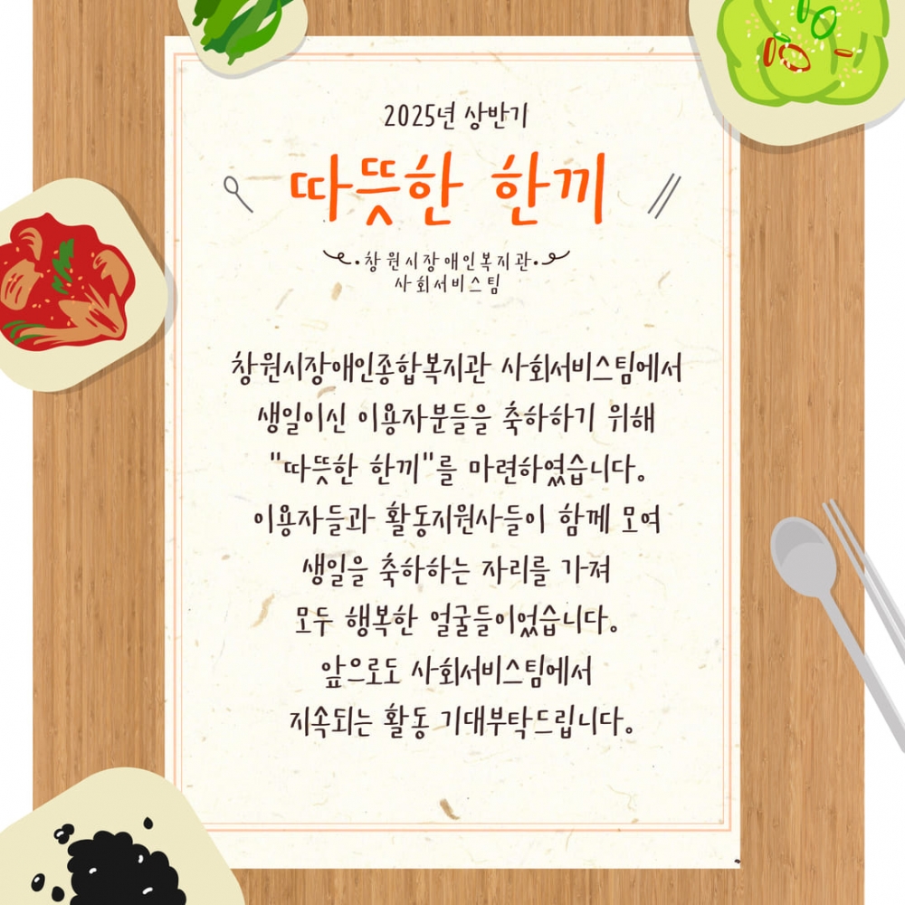 창원시장애인종합복지관 사회서비스팀에서 생일이신 이용자분들을 축하하기 위해 "따뜻한 한끼"를 마련하였습니다.