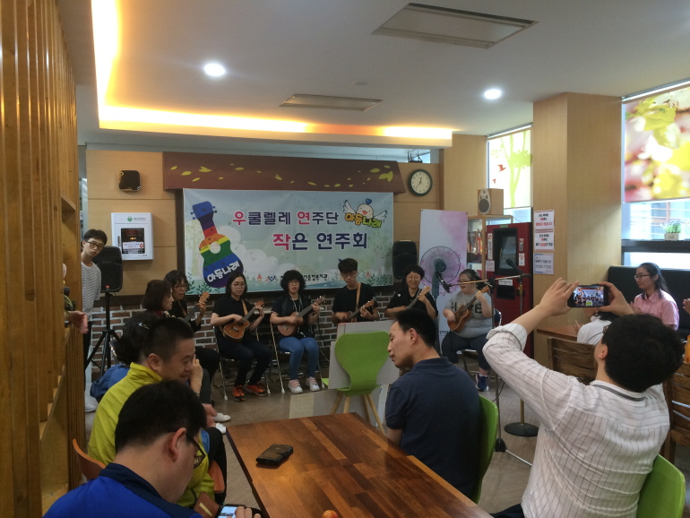 아듬나래 우쿠렐레연주단의 작은연주회가 복지관 아듬카페에서 7월18일 12시30분부터 13시까지 있었습니다. 현재 아듬나래 보호작업훈련생들의 자기능력개발훈련의 일환으로 우쿠렐레 수업을 진행 중이며, 이 수업을 받는 훈련생들 중 우쿠렐레를 좋아하고, 자존감 향상과 사회성 향상을 위하여 자조모임으로 우쿠렐레연주단을 만들었습니다. 그 첫 번째 연주회를 가졌으...