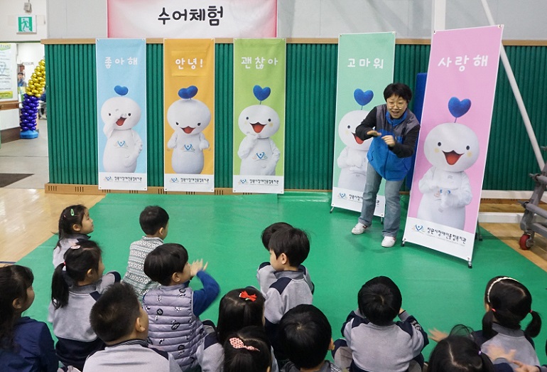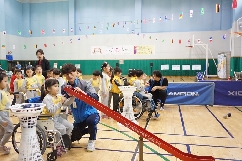 오전에는 복지관 체육관에서 지역 내 유치원생(7개 기관/251명)을 대상으로 장애인식개선체험존을 운영하여 (수어, 점자, 장애체험 / 장애인스포츠체험(컬링, 보치아) / 장애인보장구전시ㆍ체험 / 휠체어리프트차량 체험) 등을 하며 장애에 대해 관심을 가지고 이해하는 시간을 가졌습니다.