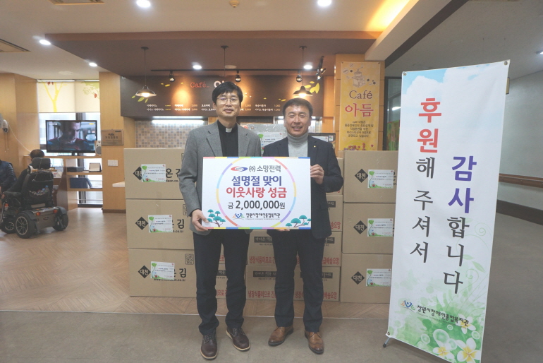 -25일(금) (주)소망전력(정동근 대표이사)은 창원시장애인종합복지관(관장 이중기)을 방문하여 설명절 이웃돕기 성금 200만원을 전달하였습니다. - 전달 된 기부금으로 설명절 세트를 구매하여 재가장애인들에게 나눠줄 예정입니다. -정동근 ㈜소망전력 대표이사는 “설명절을 맞이하여 주변의 어려운 이웃들을 돕고자 기부를 결심하였고 앞으로도 꾸준히 기부하겠...