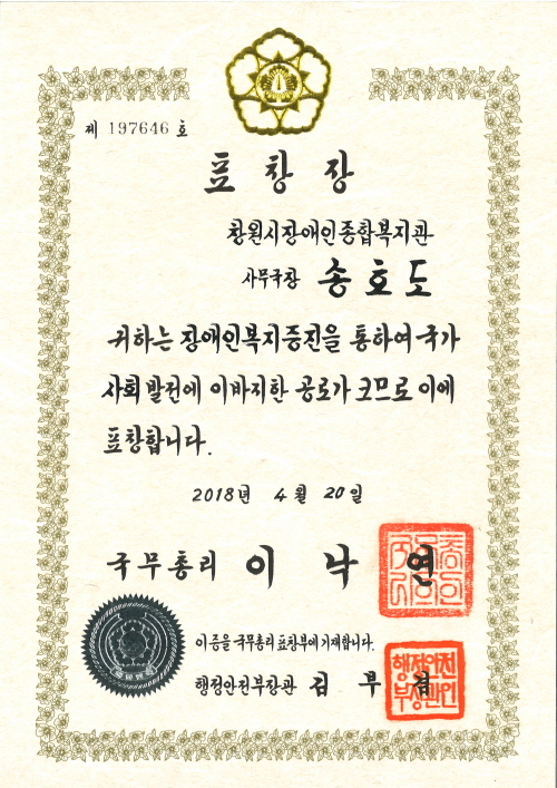 『송호도 사무국장 : 국무총리상 수상』 1993년부터 25년간 지역장애인종합복지관에 근무하며 지역사회 장애인 복지증진에 기여하고있으며, 기초재활프로그램, 지역특화 프로그램을 개발해 운영하고 활성화에 기여한 공을 인정받아 ‘제38회 장애인의 날(4월 20일)’을 맞아 국무총리상을 수상하였습니다.