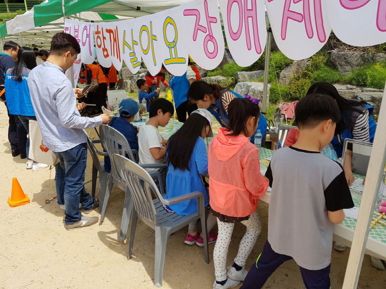 2018년 05월 05일 (토)[장애인식개선 캠페인 ‘스위치온’] 행복한 가정의 달의 시작을 알리는 어린이날 반송공원에서 지역사회주민들을 대상으로 장애인식개선 캠페인 ‘스위치 온’을 실시하였습니다. 어린이 날을 맞아 지역사회주민분들이 공원으로 나들이를 많이 나오셨었는데요. 이분들을 대상으로 점자명함만들기, 시지각협응체험등 다양한 장애체험...