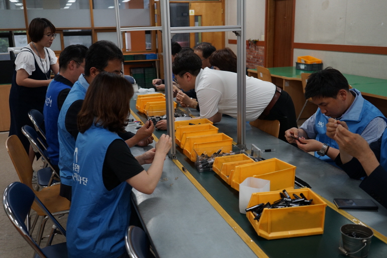 이날 참석한 우리은행 임직원 모두가 함께 보호작업장으로 이동하여 볼펜조립작업 봉사활동까지 마치셨습니다.