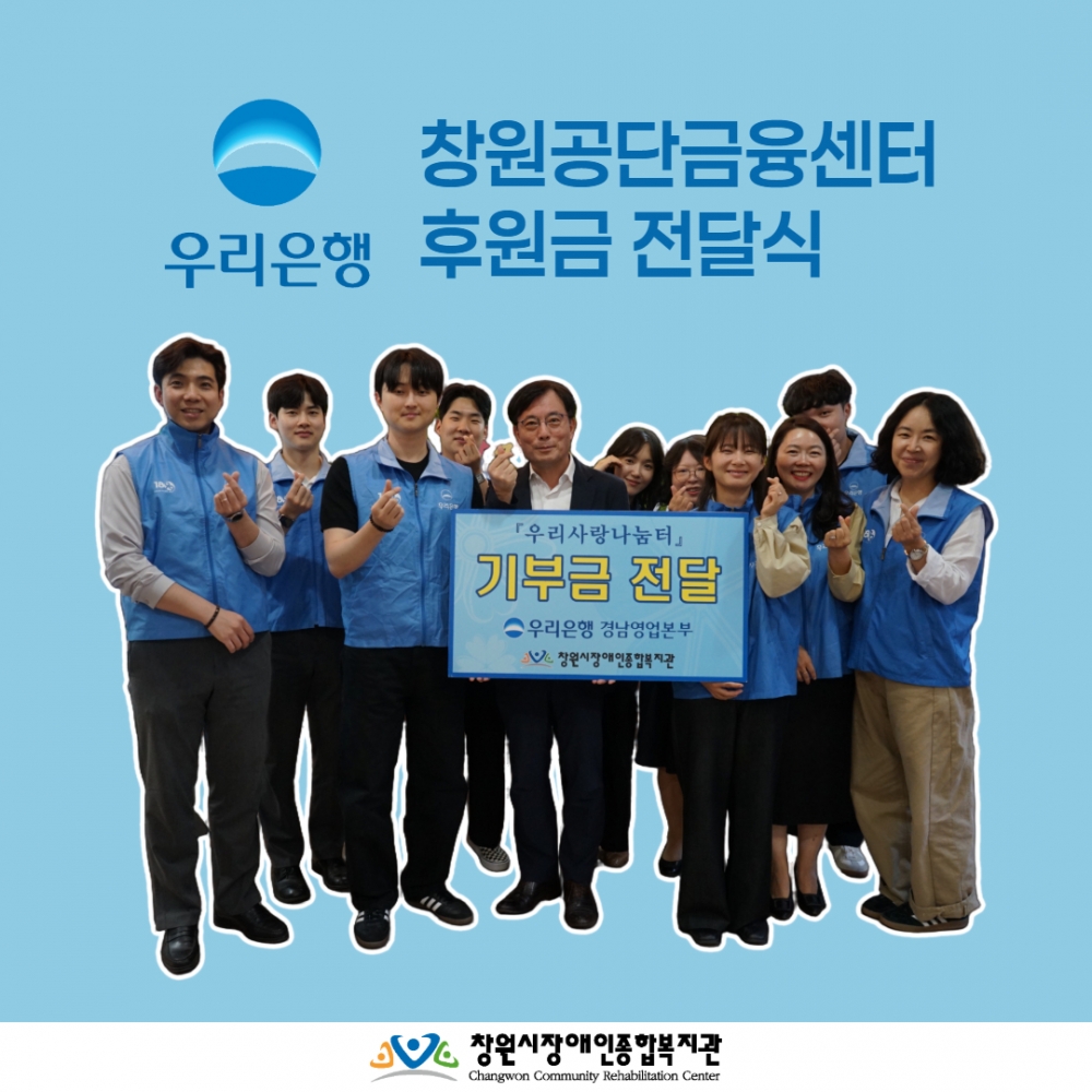 우리은행 창원공단금융센터 후원금 전달식 페이지 정보 작성자 박성현 댓글 0건 조회 706회 작성일 25-06-05 13:34 본문 6월 4일 수요일, (주)우리은행 창원공단금융센터에서 복지관을 방문하여 200만원의 기부금을 전달했습니다.이날 진행된 전달식에는 10명의 임직원이 참석했으며, 전달된 기부금은 장애인 복지 증진을 위해 사용될 예정입니다.전달식 이후 복지관 청소 등 봉사활동이 진행되었습니다.(주)우리은행은 2013년부터 복지관과 인연을 맺어 매년 봉사활동과 후원을 이어오고 있습니다.(주)우리은행 창원공단금융센터의 따뜻한 나눔에 다시 한번 감사드립니다. 관련링크 https://www.koreadisablednews.com/news/articleView.html?idxno=33155 448회 연결 이전글아듬청춘학당 웰빙자립학과 5월 활동소식 :) 25.06.05 다음글2025년 상반기 활동지원 장기근속자 포상 25.06.05 목록 댓글목록 댓글목록 등록된 댓글이 없습니다.