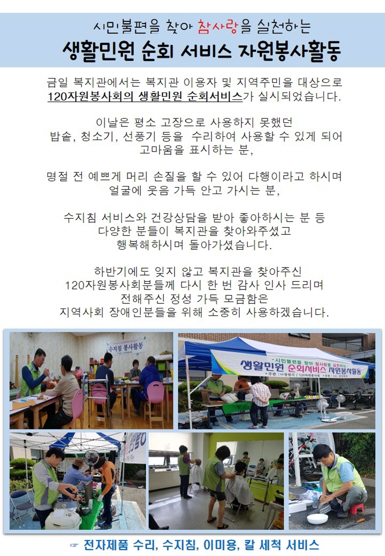 [2017.09.28(목) 120자원봉사회 생활민원 순회서비스]시민불편을 찾아 참사랑을 실천하는생활민원 순회 서비스 자원봉사활동 금일 복지관에서는 복지관 이용자 및 지역주민을 대상으로120자원봉사회의 생활민원 순회서비스가 실시되었습니다. 이날은 평소 고장으로 사용하지 못했던 밥솥, 청소기, 선풍기 등을 수리하여 사용할 수 있게 되어 고마움을 ...