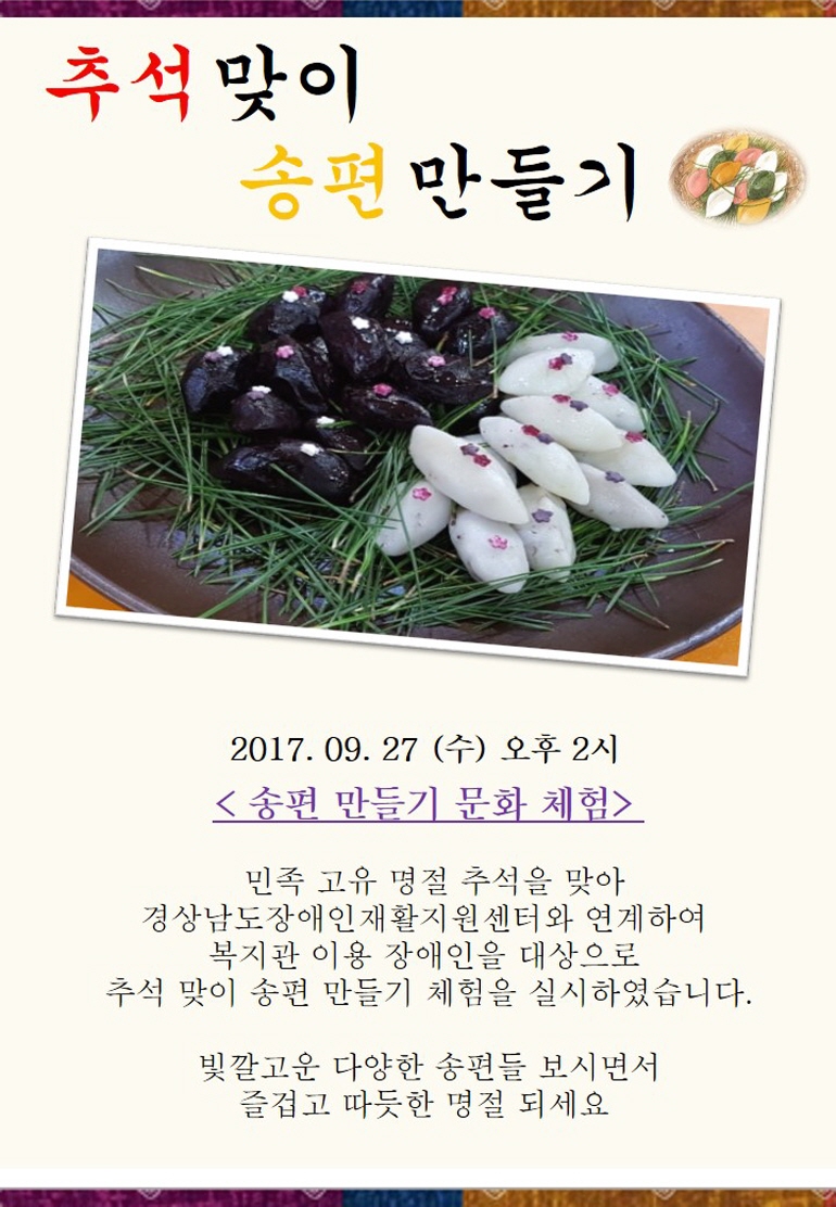 2017. 09. 27 (수) 오후 2시 < 송편 만들기 문화 체험> 민족 고유 명절 추석을 맞아경상남도장애인재활지원센터와 연계하여 복지관 이용 장애인을 대상으로 추석 맞이 송편 만들기 체험을 실시하였습니다. 빛깔고운 다양한 송편들 맛보시면서즐겁고 따듯한 명절 되세요