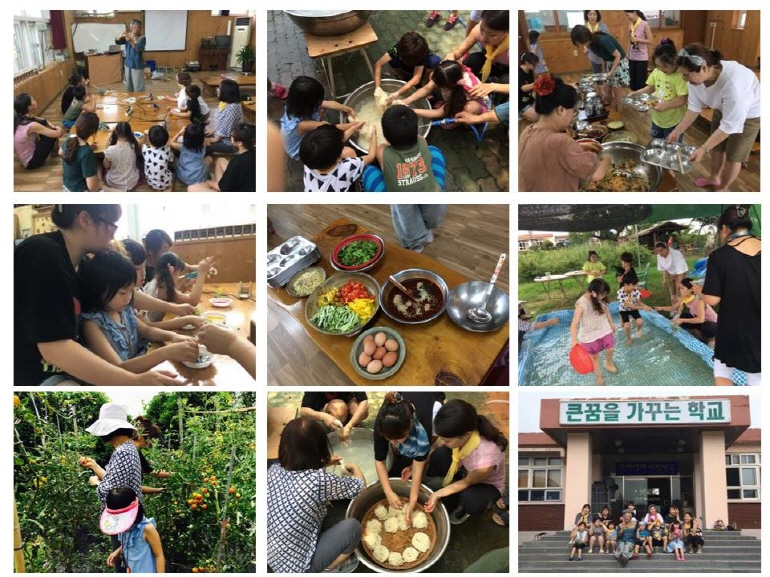 체험학습 전 기대를 많이 했던 만큼 흥미로운 수업이 많이 진행되었는데 다양한 식물염재를 활용한 천연염색활동으로 아이들은 멋진 손수건을, 어머니는 예쁜 스카프를 만들어 보았습니다. 추후 무용반 수업에 활용할 나무오카리나 만들기 활동과 텃밭에서 직접 방울토마토를 수확해 넣어보고 친구들과 국수를 씻어가며 비빔국수를 만들어보고 또 맛있게 먹었습니다.