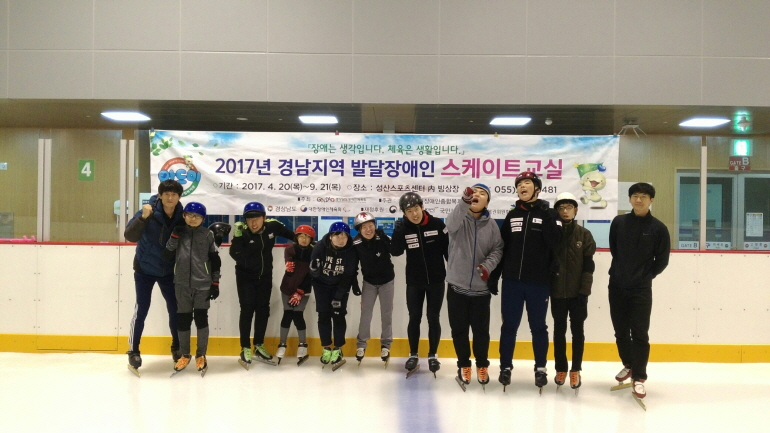 2017년 경남장애인생활체육지원사업으로 실시되는 『2017년 경남지역 발달장애인 스케이트교실』이 참가자 10명, 지도자 및 봉사자 4명으로 구성되어 성산스포츠센터 빙상장에서 개강식을 시작으로 첫 수업이 진행되었습니다.