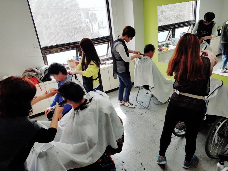 완연한 봄날씨인 금일 오전 9:30~11:30, 관내 및 방문 이미용서비스가 함께 진행되었으며 총 34명의 장애인 이용자분들이 예쁘게 머리단장을 하고 가셨습니다.