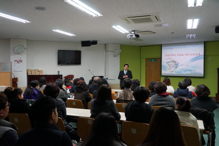 [2017. 02. 03(금) 상반기 이용자 부모교육 실시] 지난 2월 3일 (금) 14:30 ~ 16:00, 한국장애인고용공단 경남지사 최웅창 취업지원부장님이 오셔서 “발달장애인의 취업을 위한 진로설계”라는 주제로 강의를 해주셨습니다. 자녀들의 진로와 취업에 관심이 많은 청소년기, 성년기 발달장애인 자녀를 양육하는 부모님들의 참석이 많았으며, 취업...