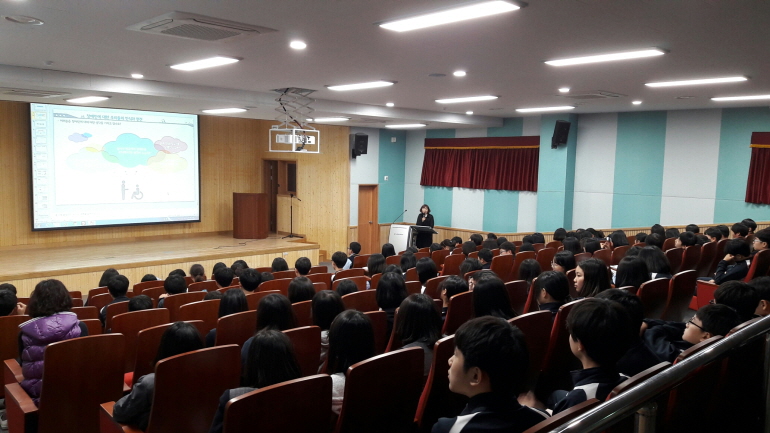 [2016. 11. 07(월) 감계중학교 학교방문 장애인식개선교육]감계중학교 1학년 125명을 대상으로 장애인식개선 교육을 진행하였습니다. 올해 개교한 학교라 1학년이 전교생인 학교였지만 집중하여 교육을 듣고 질문에 선뜻 대답하는 학생들의 모습이 인상 깊었습니다. 감계중학교에는 아직 장애인 학생이 다니고 있지 않았지만 앞으로 함께 생활을 하게 되더라도...