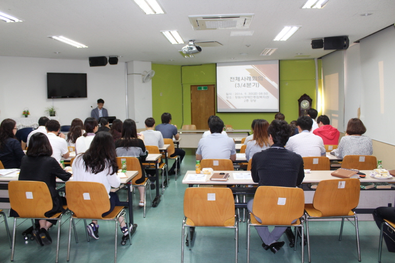 [2016. 10. 04(화) 3분기 전체사례회의]우리복지관 직원 전체가 모여 3/4분기 전체사례회의가 실시되었습니다.발달장애청소년 한부모가정을 주제로 장애청소년 사례를 공유하고 고민을 나누는 시간을 가졌습니다.사례 준비와 발표로 수고 해 주신 상담사례지원팀 전관제 팀장님 감사드립니다.수고하셨습니다.^^