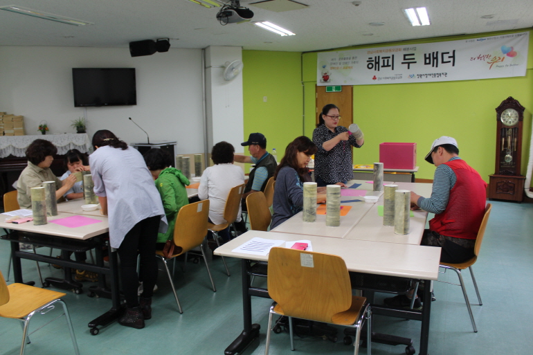 해피두배더는 A반(장애당사자), B반(장애인가족)으로 나누어 진행되고 있습니다. A반은 공예수업(한지공예) 1회와 야외활동(통영시) 1회를, B반은 공예수업(압화공예) 3회를 진행 하였고 A, B반 모두 교양강좌(장애인과 부모교육) 1회를 마쳤습니다.