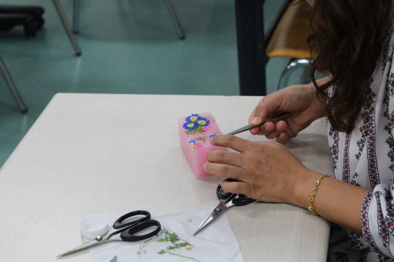 당일 오후 4시에 공예수업으로 첫 회기를 진행했습니다. 양초를 이용한 압화 공예를 하였습니다.