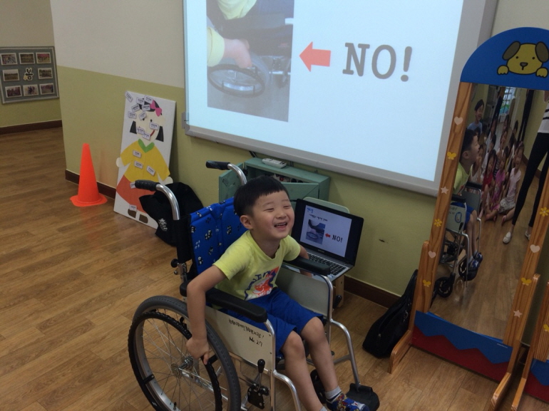 장애에 대한 일방적인 지식전달 보다는 장애에 대해 보다 편안하고 수용될 수 있는 환경조성과 이해가 필요한 시기인 만큼, 어린이집 친구들의 눈높이에 맞는 장애이해교육을 진행하고자 노력하였습니다. 캐릭터 판넬을 활용하여 친구들이 부위별 장애유형을 학습한 뒤 직접 앞으로 나와 해당 부위의 장애유형 스티커를 붙여보도록 하였습니다. 또한, 장애유형에 대한 이해교육이 마무리 된 후 휠체어의 기능과 사용법에 대한 교육 후 직접 휠체어를 타보는 체험도 함께 진행하였습니다.