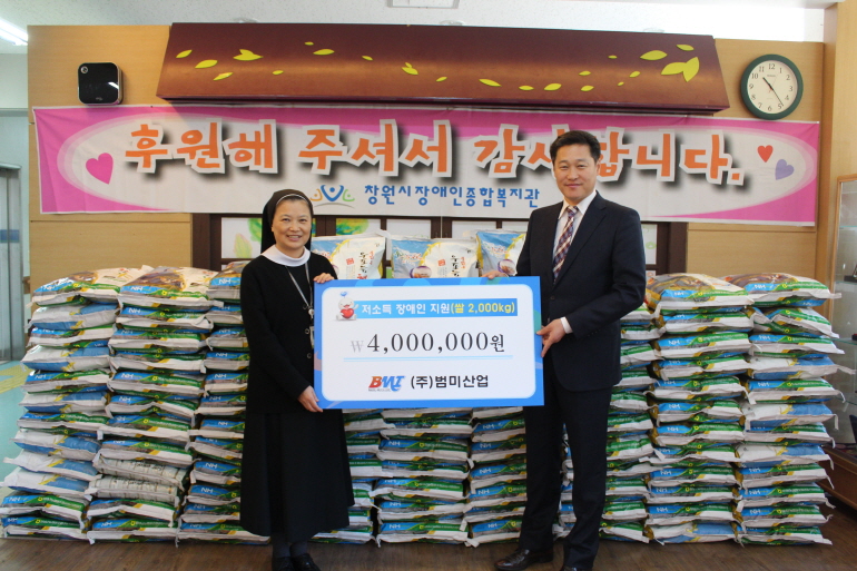 [2016. 03. 15. ㈜범미산업, 쌀 100포대 기부] 지난 15일 ㈜범미산업(대표이사 김성봉)에서 우리복지관에 20kg 쌀 100포대(400만원 상당)를 전달해주셨습니다. 이 쌀은 지난 13일 공장을 이전 하면서 ‘화환ㆍ화분을 사양하고 쌀로 대신 축하해주시면 좋은 날 소외받는 이웃들에게 사랑을 나누겠다‘는 요청으로 모은 것이라고 합니다....