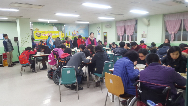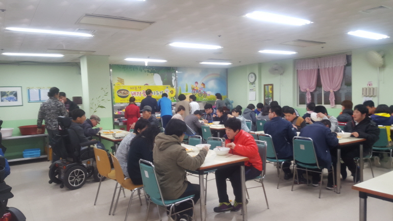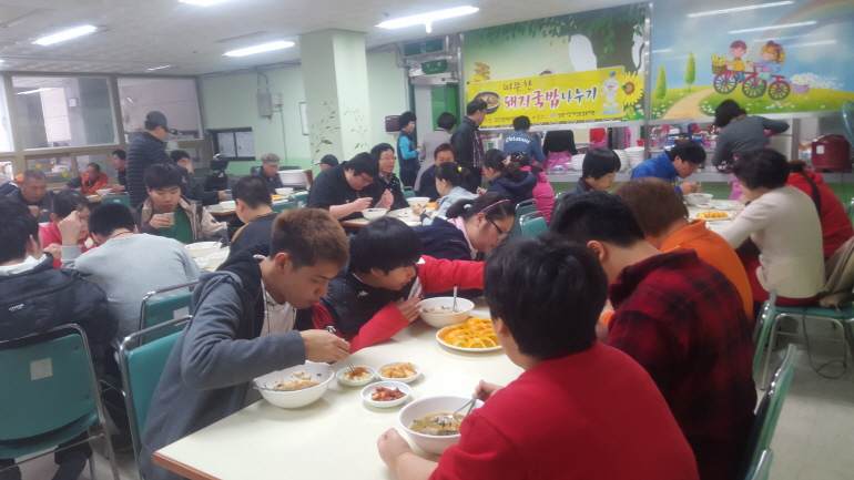 지난 2월29일과 3월23일에도 바쁘신 가운데 시간을 내시어 맛있는 돼지국밥을 장만하시어 복지관에 오셔서 지역장애인 및 이용자, 지역주민들이 따뜻한 점심식사 한 끼를 함께 할 수 있는 자리를 마련 해 주셨고 무료식사나눔을 베풀어 주었습니다. 250명의 지역장애인 및 이용자, 지역주민이 따뜻한 점심식사를 함께 하였고 2월에는 떡, 3월에는 과일을 중앙동 행복떡집과 중앙동 지역주민이 후원해 주셔서 후식으로 맛있게 먹었습니다.