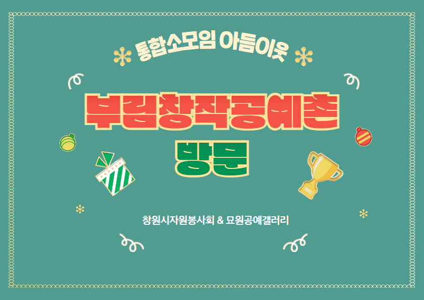 안녕하십니까~! 2024년도 마무리 되어가는데요 ㅎㅎ12/24(화) 마지막 통합소모임 아듬이웃 활동을 마산 창동예술촌과 부림창작공예촌에 다녀왔습니다~!창동 예술촌을 걸으면서 여러 작품들, 시장들을 구경하였고부림창작공예촌에 방문하여 크리스마스 이브에 딱! 맞는 화분을 만들었습니다! 약 7개월간 창원시자원봉사회와 함께 주민 모임을 진행하며 다양한 문화 체험을 ...