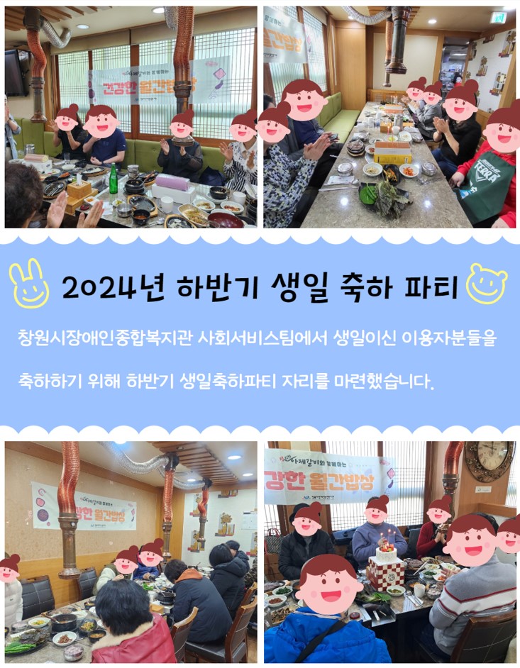 창원시장애인종합복지관 사회서비스팀에서 생일이신 이용자분들을 축하하기 위해 하반기 생일축하파티 자리를 마련하였습니다.창원시 의창구 소재의 '정직한 아제갈비'에서 맛있는 점심식사 제공해주셨습니다. 감사합니다. *^^*촛불에 불을 붙이고, 함께 생일 축하 노래를 부르며 즐거운 분위기에서 축하파티를 진행하였습니다. 앞으로 사회서비스팀의 활동 기대해주세요~